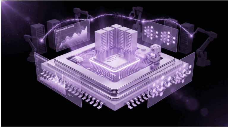 Powerful GPU chip platform with server racks, robotic arms, and performance metrics holographic displays in purple lighting
